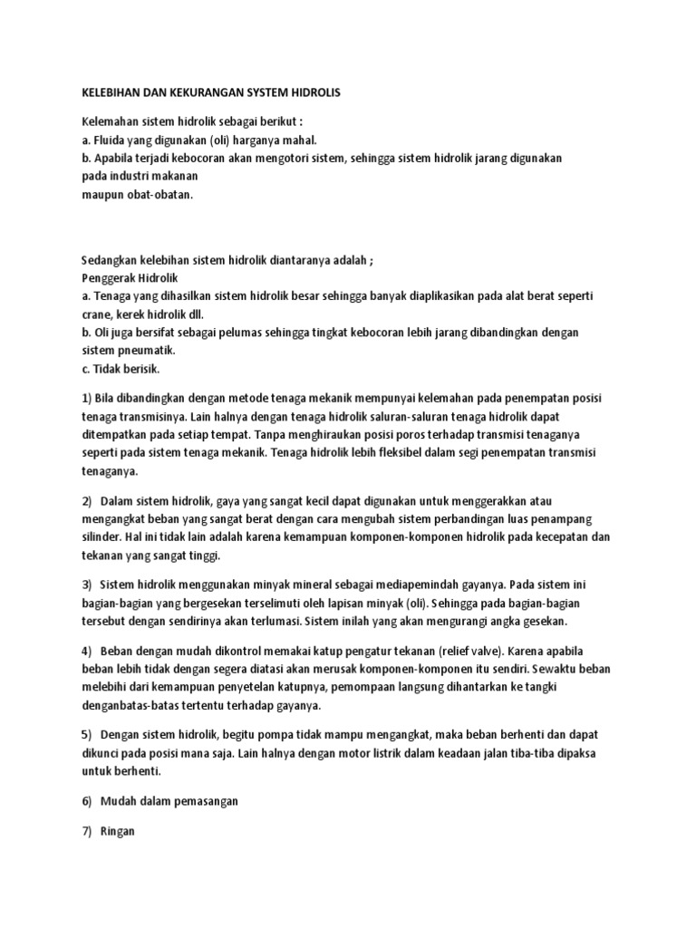 Kelebihan Dan Kekurangan System Hidrolis