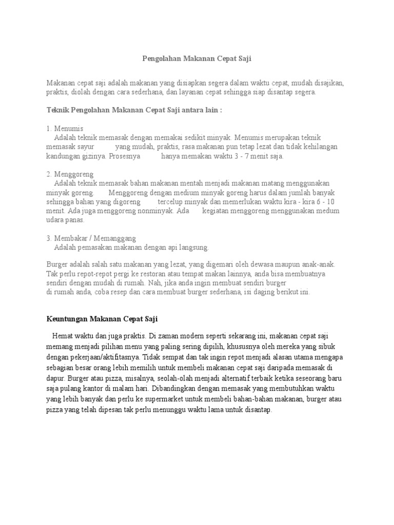11112016 Makanan segera ialah makanan yang telah siap diproses dan boleh disediakan dalam tempoh waktu yang cukup singkat. 08022012 kebaikan 1 mudah dapat informasi semasa kpd org ramai 2 dapat menambahkan ilmu pengetahuan tdk spt katak bwh tempurung keburukan. 19032015 Pemakanan makanan segera perlu menjadi sebahagian kecil daripada diet yang sihat.