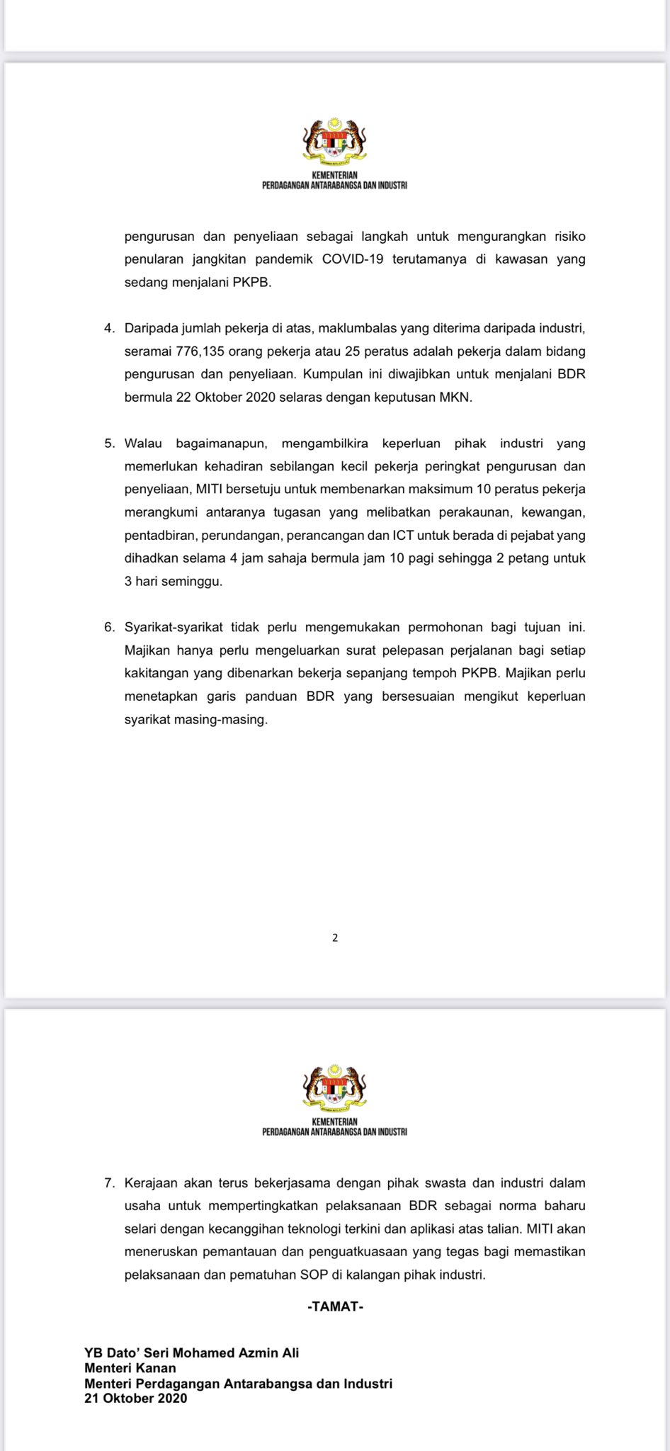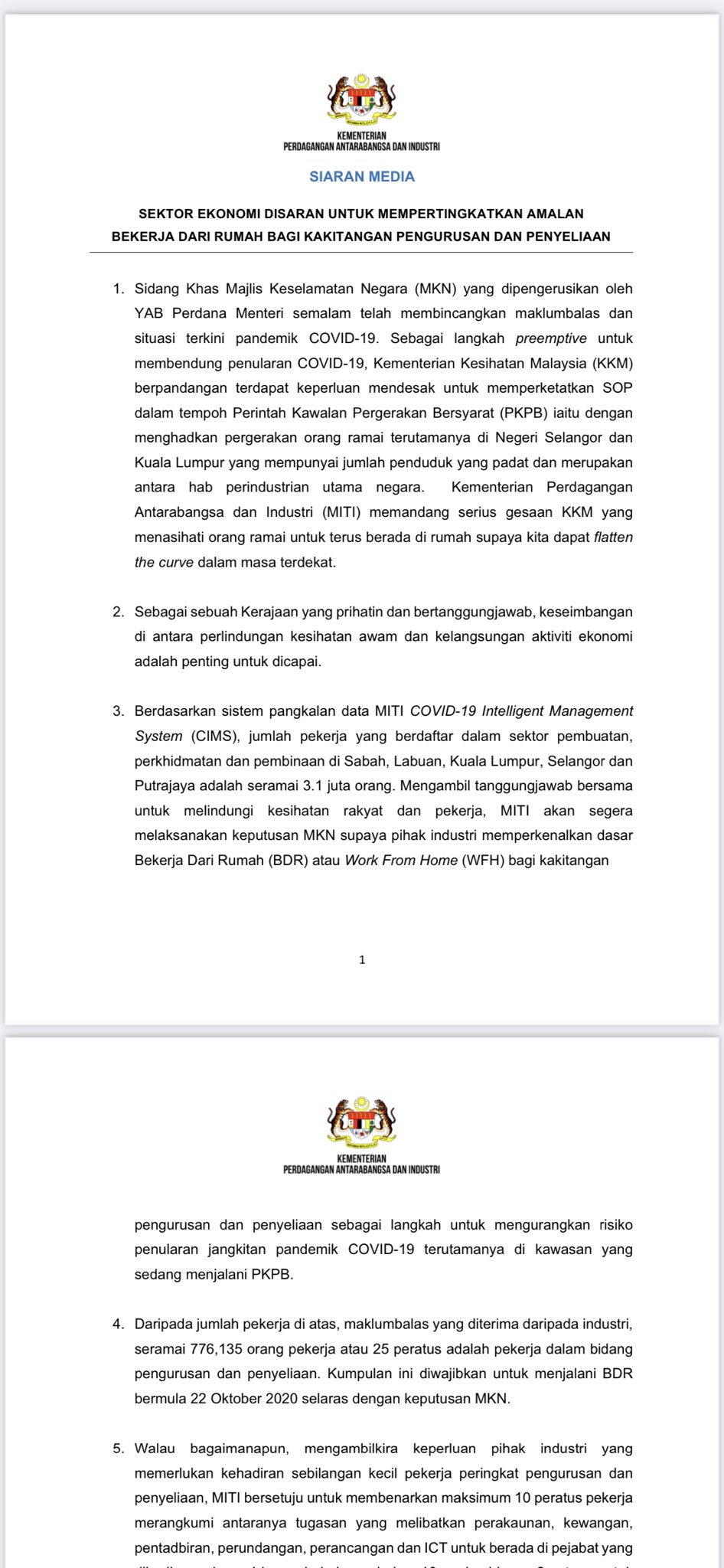 Melissa Goh On Twitter Miti Only 10 Of Workforce In A C Finance Admin Legal Planning And Ict Departments Are Allowed To Come Into Office To Work Limited To Four Hours
