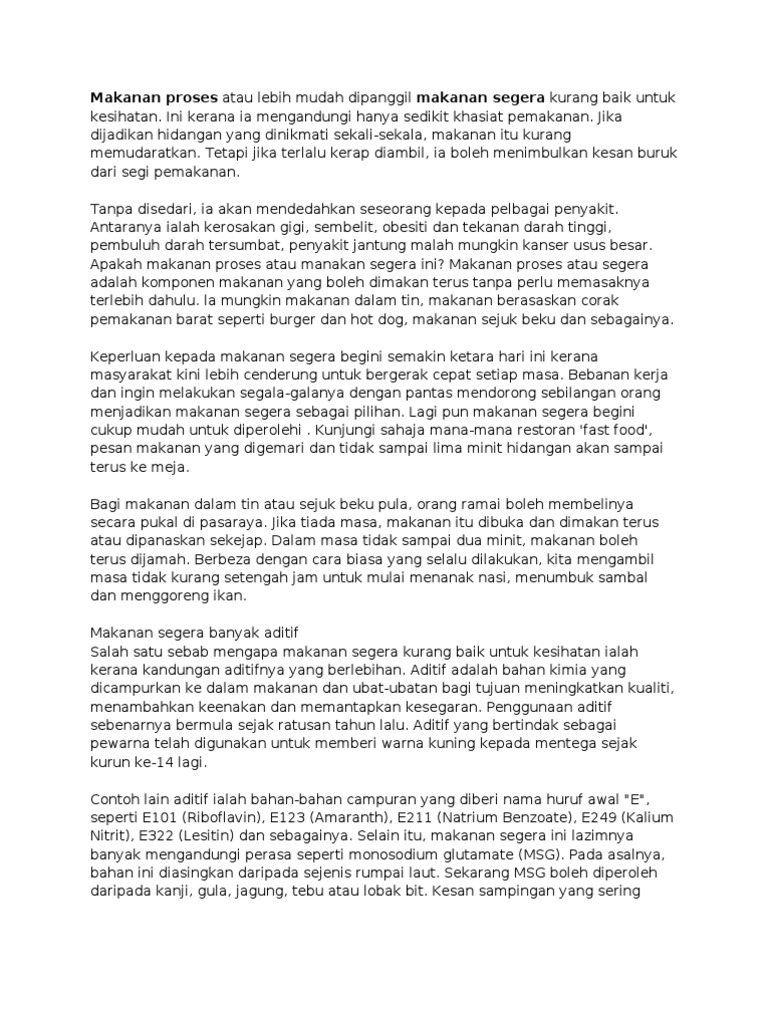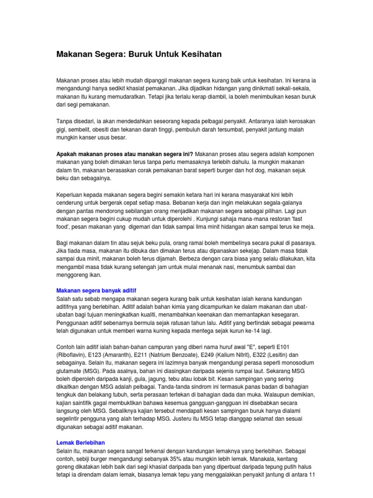 Kandungan dalam makanan tersebut yang menjadi punca utama keburukan mengambil makanan segera secara kerap. Makan makanan segera dapat mengenyangkan perut disamping mendapat nutrisi-nutrisi keperluan badan. 14062016 Bahaya kegemukan telah menjadi suatu sindrom baru rakyat Malaysia yang dikatakan berpunca daripada pengambilan berlebihan makanan segera yang mengandungi lemak dan gula yang tinggi.