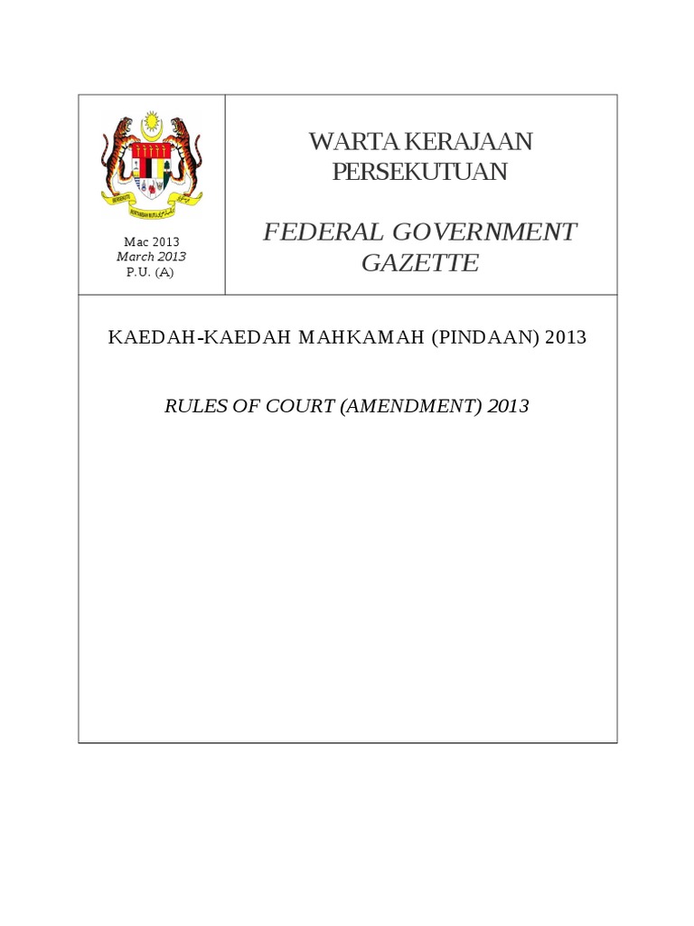 1 PUA 2862012 27 September 2012 Dear SirMadam ReRULES OF COURT 2012 PUA 2052012 PUA 2862012 AMENDMENTS Thank you for your kind support to our publication and for purchasing a copy. B Membuat secara bertulis atau menandatangani apa-apa akuan borang laporan perakuan atau dokumen lain yang dikehendaki oleh Akta Keselamatan Sosial Pekerja 1969 atau mana-mana peraturan yang dibuat di bawah Akta yang tidak benar atau tidak betul. RM12000 RM2400 RM9600.